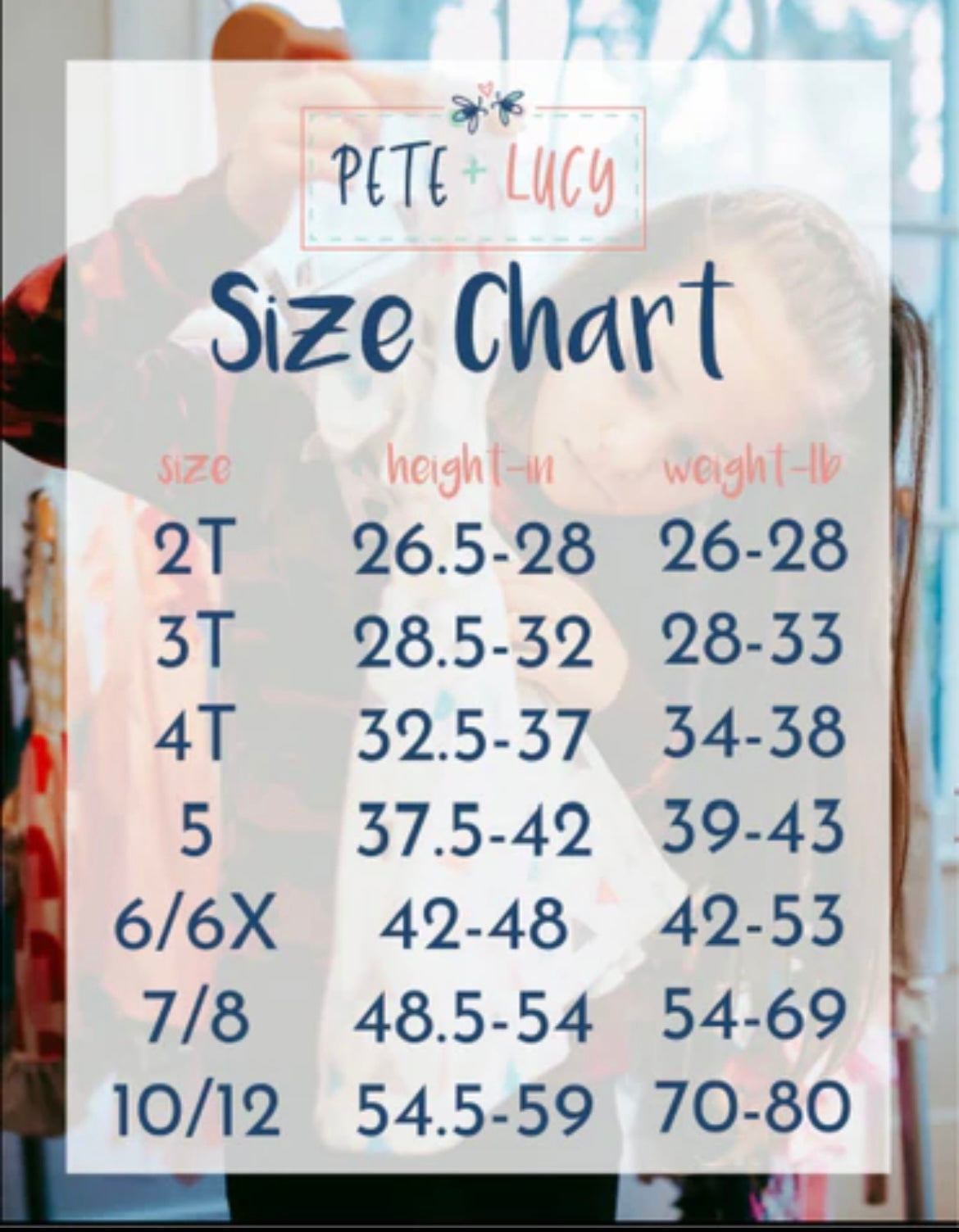 **Sizing typically runs generous for dresses. This is purposeful as the items are designed for a baggy, boutique feel leaving room to grow. Please refer to the size chart. We always recommend sizing down if the child is at the beginning of the size.